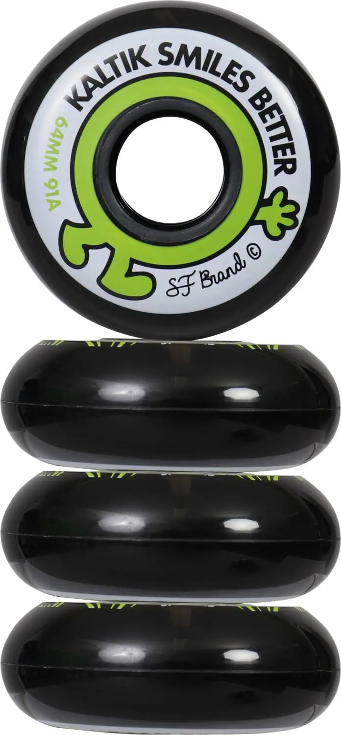 Perfect upgrade or replacement SF 64mm Wheels by Kaltik. The Kaltik Smiles are the result of a great collaboration with the one and only Scottish S.F Brand. This wheel features a 64mm 91a with a tapered bullet profile and double-sided graphic.