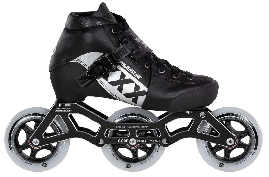 Powerslide XXX Justerbar er et par speed skates, og de byder på en god sammenhæng mellem performance og pris. Vær forberedt på at disse rulleskøjter er ultrahurtige. På disse Powerslide speed skates finder du en one-piece støvle. Fordelene ved en one-piece konstruktion er, at du får bedre respons og en tæt og behagelig pasform. Powerslide XXX Justerbar er små i størrelsen. Vælg gerne en størrelse større end din normale skostørrelse. Disse rulleskøjter passer dig, hvis du har lidt smalle fødder.