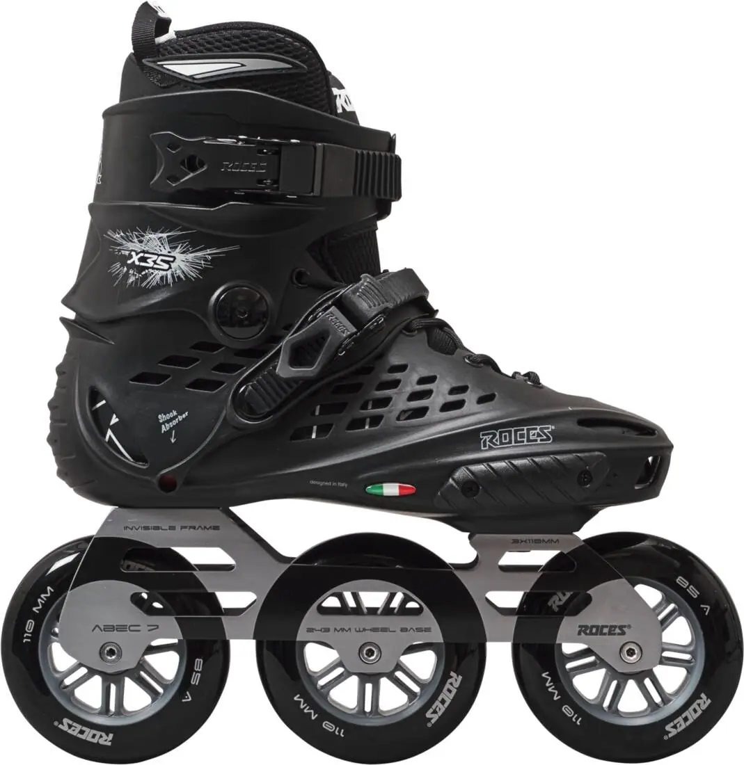 Roces X35 110 er et par freeskates, og de er designet til de bedste præstationer. De er designet til urban freestyle og freeskate med høj fart og masser af spænding. På disse Roces freeskates finder du en hård støvle. Så hvis kraftoverførsel og støtte er vigtigt for dig, har du her et par rulleskøjter, der leverer det du søger. Roces X35 110 er små i størrelsen. Vælg gerne en størrelse større end din normale skostørrelse.