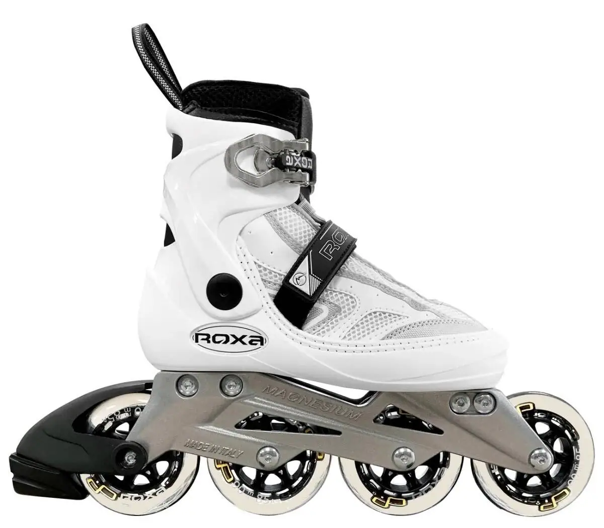 Roxa F-9 Hvid er et par inliners til kvinder, og de er et rigtig godt sted at starte, hvis du gerne vil i gang med at udforske sporten. De er et oplagt valg til udendørs aktiviteter, træning og transport. Disse Roxa inliners er udstyret med en semi-soft støvle i høj kvalitet. Du får det bedste fra begge verdener, da den semi-bløde konstruktion både er stabil og komfortabel. Roxa F-9 Hvid er små i størrelsen. Vælg gerne en størrelse større end din normale skostørrelse. Disse rulleskøjter passer dig, hvis du har lidt smalle fødder.